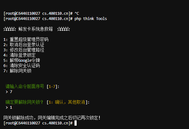 众所邹知,鲸发卡的网关锁只能通过工具箱的形式关闭,而工具箱命令官方文档是需要联系客服的,太麻烦了,使用以下命令即可 php think Tools 在你的程序安装目录使用!!! 在你的程序安装目录使用!!! 在你的程序安装目录使用!!! 使用PHP7.3以下的命令行版本