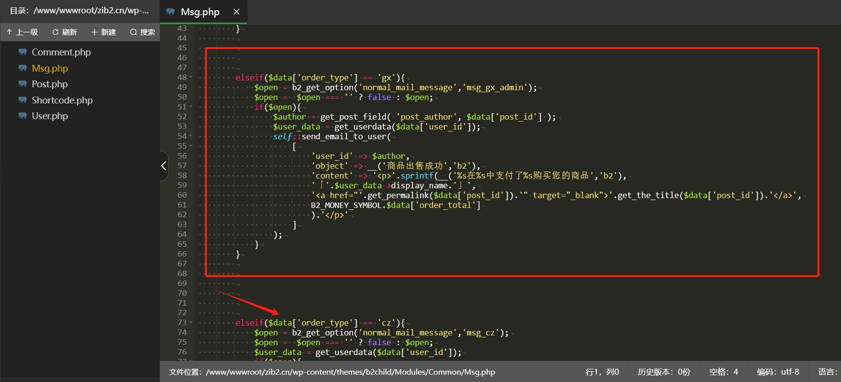 编辑 b2/Modules/Common/Msg.php,搜索代码 elseif($data['order_type'] == 'cz'),在此代码前方插入以下代码。